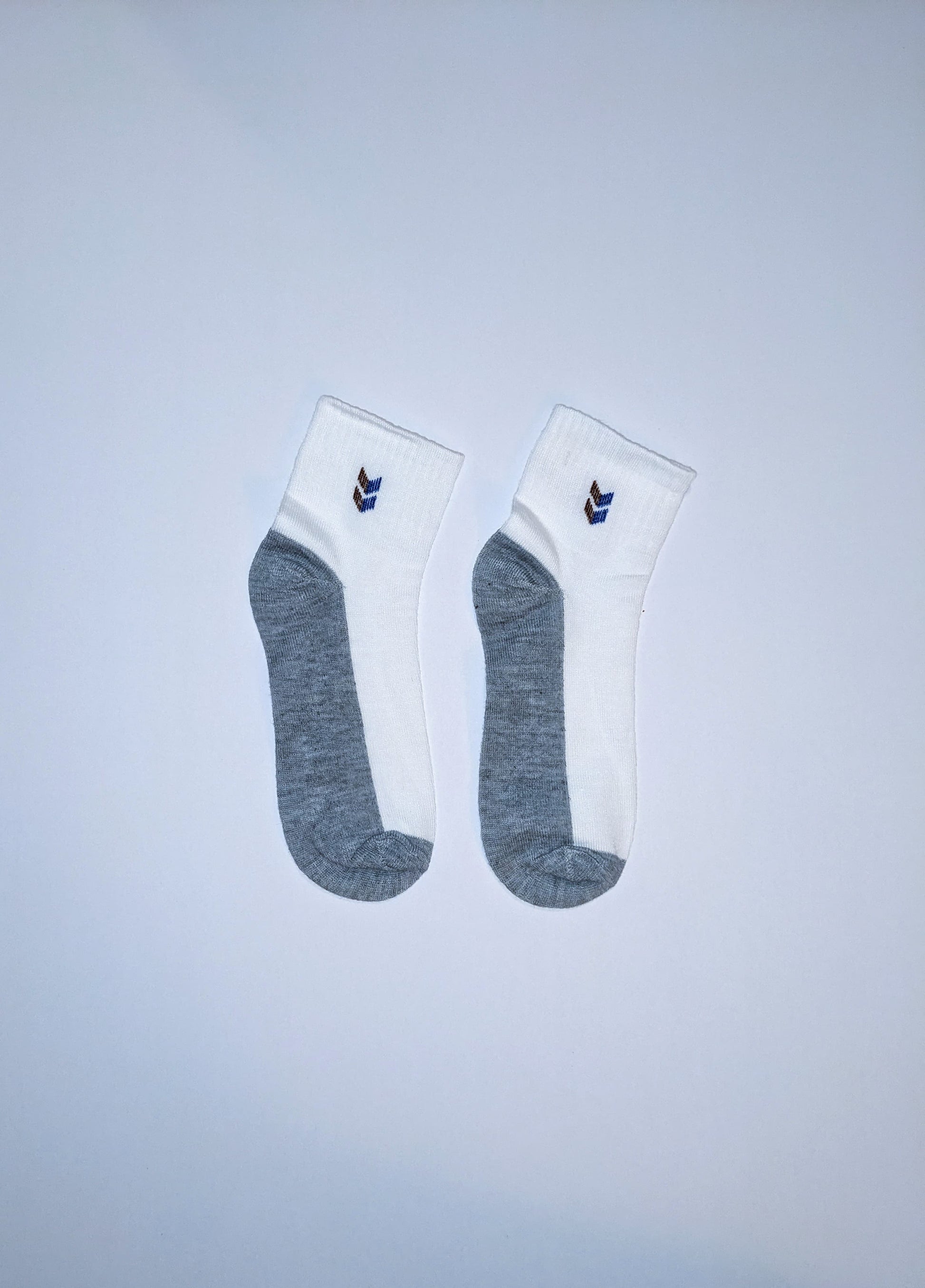 This are white with gray ankle socks that have a double chevron accent. See the third photo for comparison to other styles of socks.